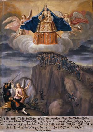 Intorno al 1809 nel Tirolo storico si registra una notevole produzione di immagini votive. La ragione è chiara: in un periodo segnato dalla guerra, molti perdevano i propri cari a causa delle uccisioni o della miseria, rimanendo soli. Incendi, furti e saccheggi erano all’ordine del giorno e l’unico rimedio per chi giaceva nella disperazione era confidare in Dio, nella Vergine o nei Santi gettando su di loro i propri affanni.