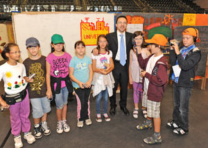 Il vicepresidente della Provincia Christian Tommasini assieme al direttore del VKE Roberto Pompermeier ed alcuni collaboratori del progetto "Voluntariat per les Llengües" oggi, martedì 7 giugno 2011, ha presentato il minivolontariato linguistico destinato ai ragazzi della MiniBZ 2011, in svolgimento presso il Palasport a Bolzano.
