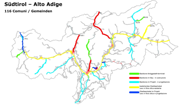 Nel corso dell'anno che si sta per concludere la rete è cresciuta di altri 160 km. per quanto riguarda l'infrastruttura principale, e di 100 km. per ciò che concerne la fibra ottica. "L'obiettivo di collegare alla rete telematica provinciale tutti i comuni altoatesini entro la fine del 2013 - conclude Florian Mussner - è dunque sempre più realisticamente raggiungibile, visto che le tratte restanti sono già in fase di progettazione: a meno di avvenimenti imprevedibili i lavori saranno completati nei prossimi 12 mesi". La prima tappa del nuovo anno scatterà a gennaio in Alta Val Venosta (45 km.) e proseguirà poi in Valle Aurina (65 km.) e lungo la tratta Bressanone-Brennero (50 km.).
