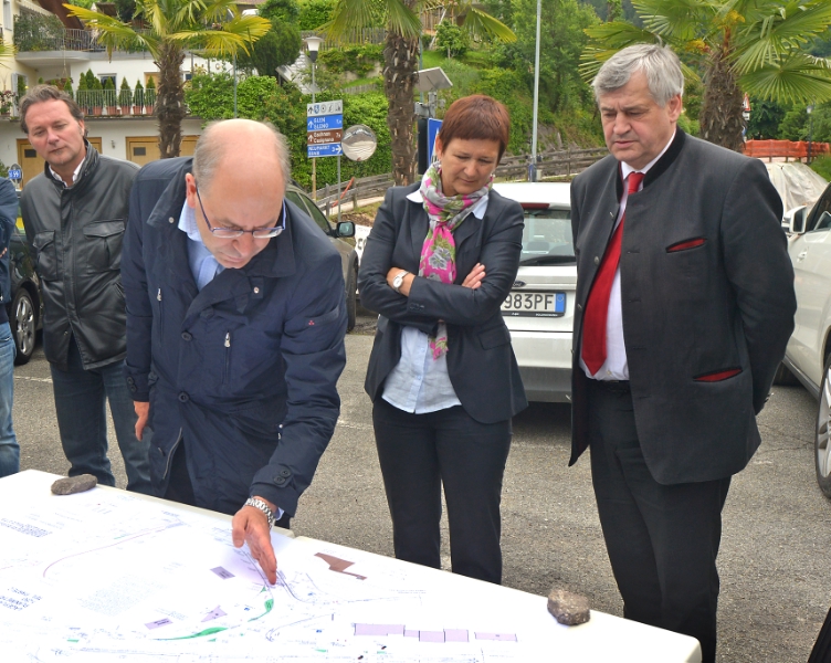 L'assessore provinciale ai lavori pubblici Florian Mussner assieme al sindaco di Montagna Monika Delvai Hilber oggi, giovedì 30 maggio 2013, hanno effettuato un sopralluogo al cantiere per la riorganizzazione dell'incrocio fra la strada statale e le provinciali a Montagna.