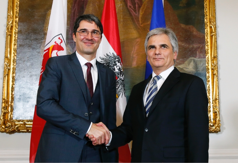 Prima stretta di mano: il Presidente della Provincia di Bolzano Arno Kompatscher accolto a Vienna dal Cancelliere austriaco Werner Faymann