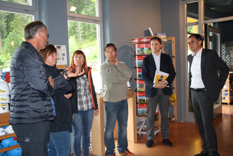L'assessore Theiner con i responsabili del GEOPARC Bletterbach davanti al Centro visite di Aldino. Foto USP/rm