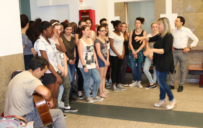 La visita alla stazione ferroviaria da parte delle componenti del coro, dirette dalla docente Roberta Ratti, con l'accompagnamento alla chitarra di Claudio Decarli, s'inquadra nell'approfondimento delle tematiche della solidarietà e della testimonianza umana che sono state trattate in questi mesi da alcune classi dell'istituto.