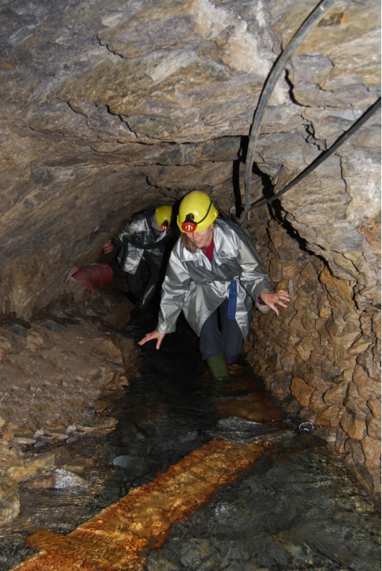 Dopo la pausa pranzo i partecipanti, attrezzati con stivali, cerata, elmetto e lampada frontale, vengono trasportati con un bus all'imbocco della galleria Poschhaus, a 2.000 metri di quota, da dove si entra a bordo del trenino dei minatori per 3,5 km nella montagna, fino al giacimento del minerale.