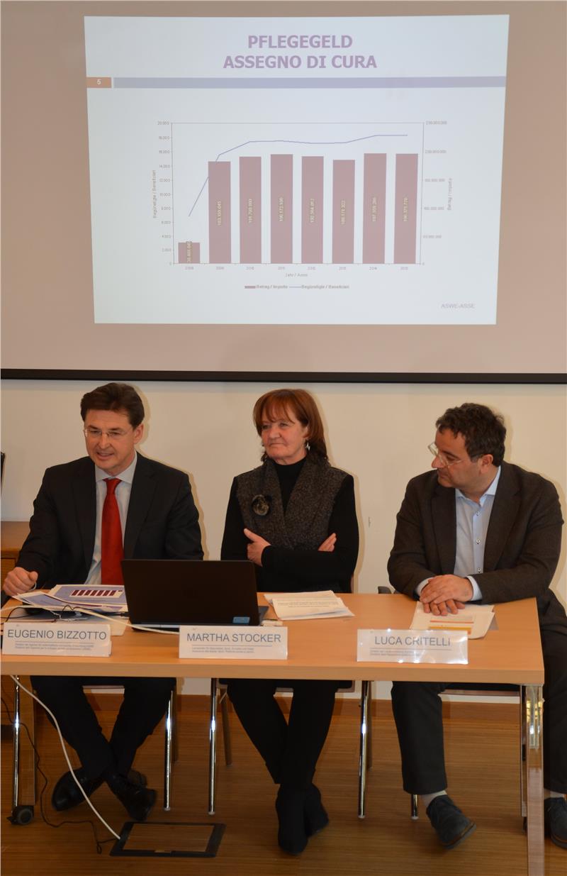 Con impegni di spesa per 410 milioni di euro la Ripartizione provinciale politiche sociali è intervenuta a garantire servizi e prestazioni sociali nel 2015 in Alto Adige: con 110 milioni di euro sono stati finanziati i servizi sociali delle comunità comprensoriali e dei comuni nonché l’offerta sul territorio per famiglie, bambini e giovani, anziani, persone con disabilità, con problemi psichici, con patologie da dipendenza, persone con bisogni specifici. Circa 54 milioni di euro sono stati destinati dalla Ripartizione all’assistenza economica sociale, 200 milioni per l’assegno di cura e le pensioni di invalidità civile, circa 26 milioni di contributi per i servizi sociali e quasi 20 milioni di euro per investimenti nel settore sociale. A beneficiare di queste misure, come ha illustrato il direttore di Ripartizione Critelli, sono state 5.380 persone nell’assistenza domiciliare (il 3,7% in più rispetto al 2014, con 310mila ore di servizio prestate), 4.219 anziani nelle case di riposo, 10.722 minorenni e adulti assistiti sul piano sociopedagogico, 1391 persone con disabilità nelle strutture residenziali, in laboratori e centri diurni, 340 persone affette da problemi psichici e i 95 assistiti per patologie da dipendenza. I contributi e i beneficiari del reddito minimo di inserimento sono leggermente calati nel 2015 (meno 2,5%), i contributi al canone di locazione e per le spese accessorie sono aumentati del 18.9%, un incremento tuttavia riconducibile quasi esclusivamente al fatto che il sussidio casa pagato dall’IPES e la prestazione locazione e spese accessorie erogata dai Distretti sociali, sono stati riuniti in un’unica prestazione. Questa fase transitoria sarà conclusa entro la metà del 2016.