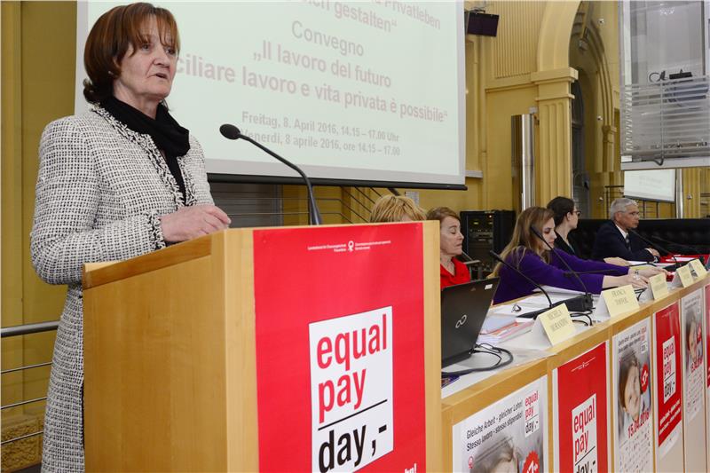 Alla maggior conciliabilità fra lavoro e vita privata è dedicata la Giornata 2016 della parità di retribuzione Equal Pay Day. Aprendo i lavori del convegno "Il Lavoro del futuro" in svolgimento oggi 8 aprile per la ricorrenza, l'assessora provinciale Martha Stocker ha affermato che sarebbe bello poter far meno dell'Equal Pay Day, perché significherebbe aver raggiunto la parità di retribuzione.