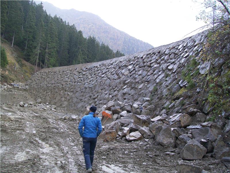 Le opere paravalanghe si compongono di uno sbarramento in terra e di una muraglia di massi a monte alta fra i 10 e i 13 metri.