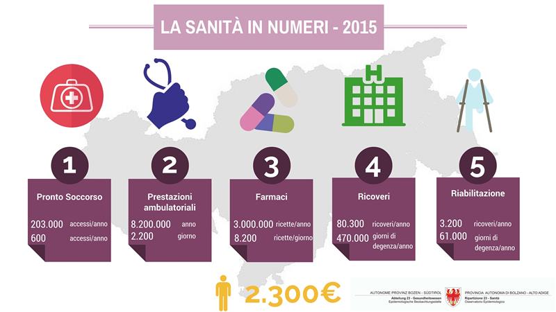 Nel corso del 2015 sono state emesse complessivamente in Alto Adige circa 3 milioni di ricette di farmaci con una media di 8.200 al giorno, gli accesi al pronto soccorso sono stati 203.000 pari a circa 600 al girono: i giorni di degenza post acuti sono stati 61.000 mentre i ricoveri in riabilitazione 3.200; i giorni di degenza per pazienti acuti 470.000 ed i ricoveri 83.000; le prestazioni ambulatoriali nel corso del 2015 sono state complessivamente 8,2 milioni, circa 22.500 al giorno.