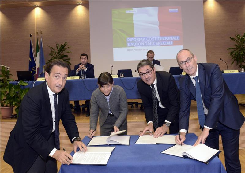Il presidente Arno Kompatscher ha sottoscritto stasera a Udine – assieme alla presidente del Friuli Venezia Giulia, Debora Serracchiani, al presidente della Provincia di Trento Ugo Rossi e all’assessore alle riforme della Sardegna, Gianmario Demuro – la cosiddetta “Carta di Udine”. Il documento sul futuro delle autonomie nel tessuto della Costituzione è stato poi consegnato al ministro per gli affari regionali e le autonomie Enrico Costa, presente a Udine. Nella discussione sulla riforma costituzionale - hanno sottolineato Kompatscher, Serracchiani e Rossi - questo memorandum prefigura un impegno forte per il sistema delle autonomie speciali a cominciare dalla procedura di revisione dello Statuto con lo strumento dell’intesa, per cogliere fino in fondo le opportunità della riforma, se sarà realizzata. Per i Presidenti si pone come un punto di partenza per la riforma, "che dovrà essere un percorso di revisione senza arretramenti e arroccamenti."