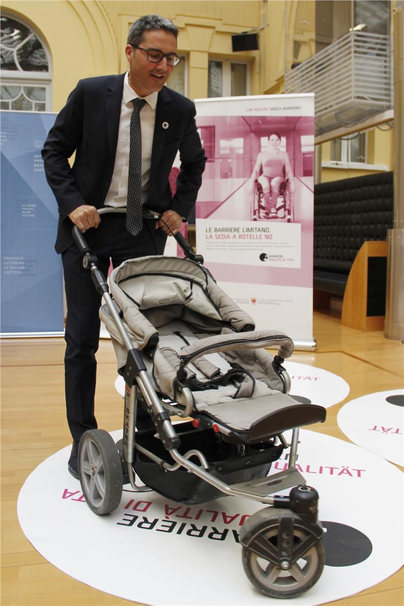 Al termine della conferenza stampa sia il preside Arno Kompatscher che l’assessora Martha Stocker hanno esemplificato l’uso del tappeto utilizzando rispettivamente una sedia a rotelle ed una carrozzina per bambini.