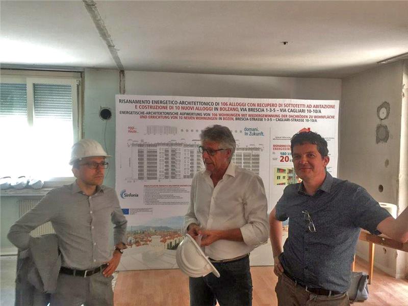 “Sinfonia” è un progetto europeo che viene sviluppato a Bolzano e a Innsbruck e in altre cinque città nell’arco di cinque anni. Gli interventi riguardano il risanamento energetico nell’edilizia sociale, la produzione e distribuzione di calore, le tecnologie intelligenti per monitorare l’ambiente e il fabbisogno energetico della popolazione. In questa sede vengono testate soluzioni innovative che potranno divenire un modello europeo nella gestione sostenibile dell’energia che potrà essere seguito da altre città. Ai civici di via Cagliari 10 e 10/A, un complesso risalente alla seconda metà degli anni '70, e in via Brescia 1, 3 e 5 a Bolzano, l’Istituto per l’edilizia sociale IPES ha in corso il primo lotto di lavori di risanamento di 106 alloggi con il recupero di sottotetti ad abitazione per un totale di 10 nuovi alloggi, mentre 12 appartamenti attualmente vuoti vengono ristrutturati nel corso del cantiere per la riassegnazione. La maggior parte dei lavori dovrebbe essere ultimata entro l’autunno 2017, quindi si proseguirà con il secondo lotto, che comprende le 2 scale di via Brescia 1-3-5 e dovrebbe essere completato a giugno 2018. Il cantiere, infatti, è stato diviso in due lotti, per ridurre al minimo il disagio degli inquilini.