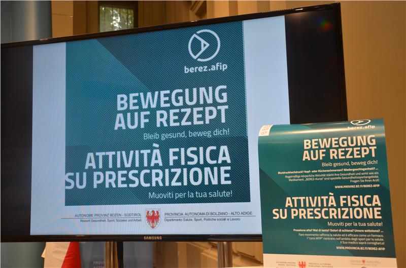 su prescrizione - AFIP", promossa dal Dipartimento alla salute, sport, politiche sociali e lavoro, in collaborazione con l’Azienda sanitaria e la Società altoatesina di medicina generale, vuole essere uno strumento per sostenere l’attività già oggi svolta dal medico di famiglia nel campo della prevenzione primaria. D'ora in poi il medico di famiglia sarà in grado di offrire ai propri pazienti una prescrizione per lo svolgimento di attività fisica. Non si tratta di una prescrizione vincolante ma di un consiglio del medico a favore di una maggiore attività fisica e di stili di vita più sani. "Contiamo che con questo nuovo strumento - ha spiegato l'assessora Martha Stocker - venga rafforzata l’autorevolezza del consiglio del medico e che nella popolazione cresca la consapevolezza che ciascuno di noi può fare molto per la propria salute: l’attività fisica, infatti, può prevenire molte manifestazioni patologiche anche di carattere psichico".