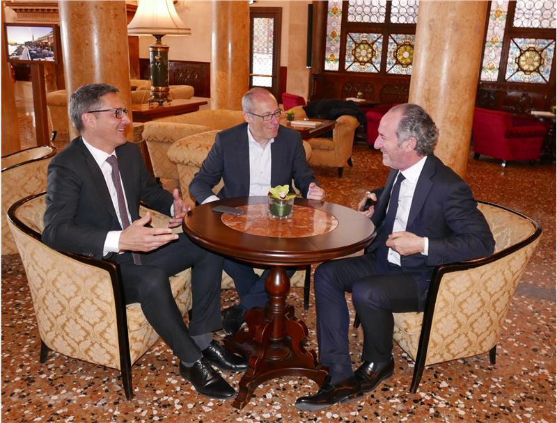 Il presidente della Provincia di Bolzano, Arno Kompatscher, ha incontrato oggi (26 marzo) a Venezia il presidente della Regione Veneto, Luca Zaia, e il presidente della Provincia di Trento, Ugo Rossi. Numerosi gli argomenti affrontati durante l'incontro: dalle possibili collaborazioni sul fronte infrastrutturale e viabilistico, ai temi dei trasporti, dell’acqua e, più in generale, ai problemi della montagna. Kompatscher, Zaia e Rossi hanno poi approfondito l’ipotesi relativa all’organizzazione delle Olimpiadi invernali 2026, e dal confronto è emersa uuna piena convergenza sulla candidatura avanzata dal Veneto, e sostenuta dal Trentino, per le Dolomiti Unesco, con Cortina d'Ampezzo come città capofila.