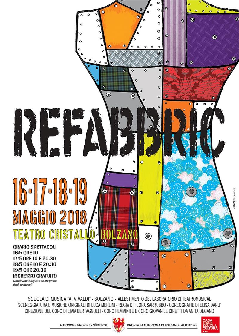 Refabbric è l’undicesima produzione del Laboratorio di Teatromusical e vede coinvolti sul palco più di 40 allievi del Vivaldi: i ragazzi del Laboratorio che hanno seguito per l’intero anno scolastico lezioni di canto, recitazione e danza, i musicisti dell’orchestra e altre due realtà del Vivaldi come il coro femminile e il coro giovanile. Le musiche, tutte originali, vengono eseguite rigorosamente dal vivo dagli allievi del Vivaldi. A settembre ripartirà un nuovo biennio del Laboratorio di Teatromusical per ragazzi dall’età compresa fra i 15 e i 29 anni.