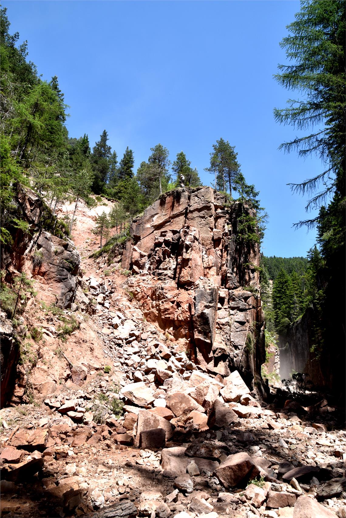 Nel corso della visita l’assessore Bessone ha potuto verificare di persona gli esiti dell’intervento di messa in sicurezza di un costone di porfido del canyon Bletterbach eseguito dai geologi dell’Ufficio geologia e prove materiali a fine giugno. I geologi provinciali eseguono controlli periodici della sicurezza del canyon. Già nel maggio 2018 al costone in questione, che presentava evidenti fessure, erano stati apposti degli estensimetri, apparecchiature apposite per monitorare i movimenti delle rocce. Nei mesi di maggio e giungo di quest’anno i dispositivi avevano evidenziato un’accelerazione esponenziale dello spostamento. A fine giugno l’intervento urgente coordinato dall’Ufficio geologia e prove materiali ha portato al brillamento del versante, programmato ed eseguito dal geologo Giacomo Nardin, e al disgaggio delle rocce pericolanti, effettuato dalla ditta Locher, per circa 200 metri cubi di materiale. In tal modo è stato reso nuovamente sicuro e percorribile ai numerosi visitatori un tratto suggestivo del canyon. Nell’operazione hanno collaborato anche il personale del Geoparc e le guardie forestali nel sorvegliare l’area durante l’intervento e nell’informare gli escursionisti.