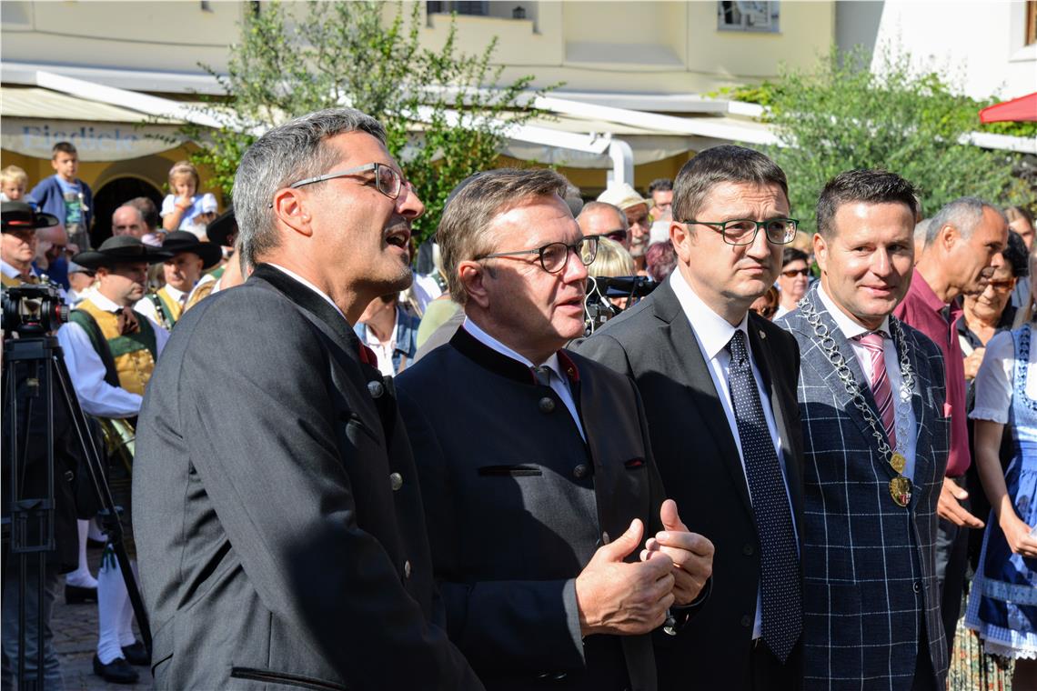 Anche il capitano tirolese Günther Platter ha sottolineato il valore della tradizione, che deve condurre al futuro: "Cento anni dopo la divisione del nostro territorio, dobbiamo fare tutto il possibile far sentire di nuovo unite le persone. Ciò richiede anche progetti concreti e questo festival ne è un perfetto esempio". Il presidente trentino Maurizio Fugatti ha parlato di "una storia comune che si riflette nel presente di oggi e conduce con uno spirito di unità nel futuro". Le tre diverse realtà del Trentino, dell'Alto Adige e del Tirolo trovano la loro unità nell'Euregio: "Questo è il suo grande valore" ha detto Fugatti. Tutti e tre i presidenti hanno sottolineato quanto siano concreti i problemi e le preoccupazioni che le tre regioni hanno in comune: combattere il cambiamento climatico, ridurre il traffico di transito, prevenire catastrofi naturali sono solo alcuni esempi. Ma anche dare risposte alle famiglie e ai giovani, coordinare le attività di ricerca e sviluppo e molto altro. E per il futuro, hanno annunciato Komptascher e Platter, arriverà un abbonamento congiunto per il trasporto pubblico. Il sindaco di Egna, Horst Pichler, lo ha definito un "raro onore dare il benvenuto a tre presidenti contemporaneamente, insieme a molti visitatori provenienti da tutta l'Euregio". Il sindaco fatto riferimento al ricco programma, a cui partecipano circa 20 associazioni, 50 spazi espositivi e molti artisti e musicisti. All'inizio della cerimonia una compagnia di Schützen ha anche consegnato personalmente ai tre presidenti una risoluzione con le proprie richieste.