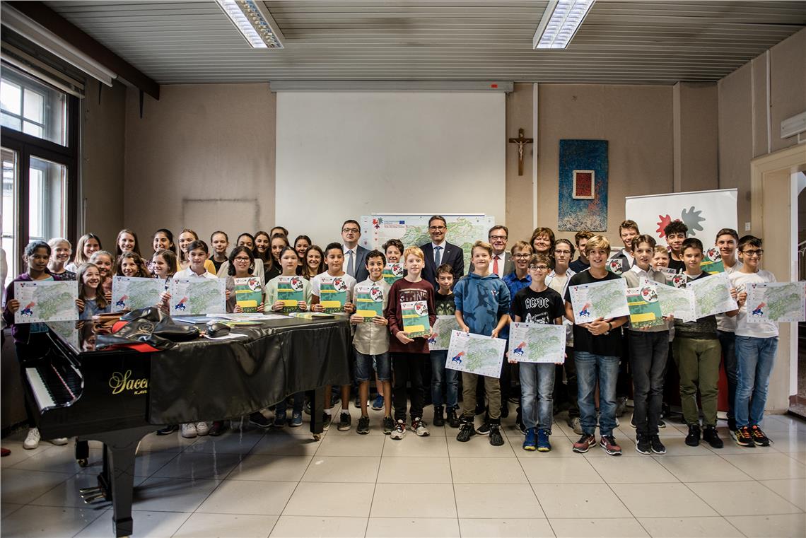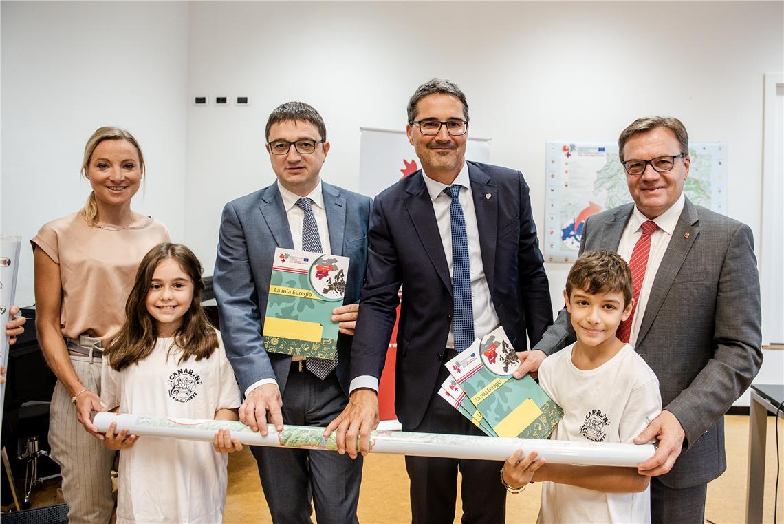 Approfondire la conoscenza dell'Euregio Tirolo-Alto Adige-Trentino e rafforzare l'interesse di bambini e ragazzi verso le regioni confinanti con una storia in comune. Questo l'obiettivo che si vuole raggiungere con la nuova cartina geografica dell'Euregio, i cui primi esemplari sono stati consegnati questa mattina (25 settembre) dai presidenti Arno Kompatscher, Günther Platter e Maurizio Fugatti ai ragazzi di due scuole di Bolzano: la scuola media "Josef Aufschnaiter" e la scuola elementare "Dante Alighieri". Il progetto è stato coordinato dalle Sovrintendenze scolastiche italiana e tedesca, dall'Ufficio programmazione e organizzazione del Trentino e dalla Bildungsdirektion del Tirolo.