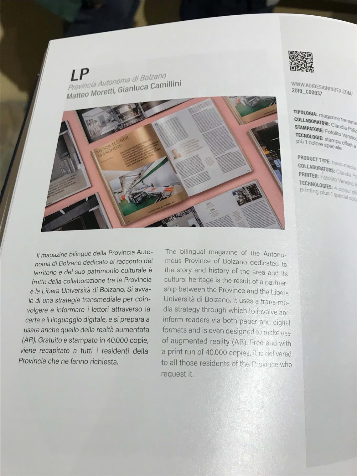 L’Osservatorio permanente del design ADI ha selezionato la rivista LP, realizzata dall’Agenzia di stampa della Provincia di Bolzano in collaborazione con un team di ricerca della Facoltà di Design di Unibz, per l’ADI Design Index 2019. E’ questo il primo volume del ciclo biennale che raccoglie i prodotti preselezionati per il Premio Compasso d'Oro ADI 2020, che è stato presentato ufficialmente ieri sera (14 ottobre) a Milano. Il premio, ideato nel 1954 da “La Rinascente” e donato poi all’ADI, è il più prestigioso riconoscimento della qualità produttiva e progettuale di beni, servizi, processi e sistemi del design italiano. L’ADI Design Index è diventato inoltre, dal 2009, oltre che preselezione per il Premio Compasso d’Oro anche selezione annuale per il Premio nazionale per l’innovazione.