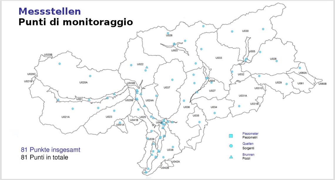 Fra i corpi idrici vi sono le acque sotterranee. In Alto Adige sono stati individuati e tipizzati 39 corpi idrici sotterranei in base ai criteri indicati nelle relative leggi e in base al quadro geologico altoatesino, contraddistinto da una notevole varietà di rocce, da quelle metamorfiche a quelle rocce magmatiche fino alle rocce sedimentarie più recenti. Le acque sotterranee forniscono un importante contributo al bilancio idrico e vengono alimentate sia dalle acque meteoriche che dalle acque superficiali. Le acque del sottosuolo danno vita alle piante e alle colture e formano preziose zone umide. Attraverso le sorgenti le acque sotterranee alimentano torrenti e fiumi e sono alla base della nostra acqua potabile. La qualità e la quantità delle acque sotterranee influenzano, non solo le acque superficiali, ma anche il nostro benessere e la nostra economia. L’obiettivo del Piano di tutela delle acque è quello di mantenere i corpi idrici sotterranei in un buono stato ambientale, in modo da garantirne la qualità e le quantità.