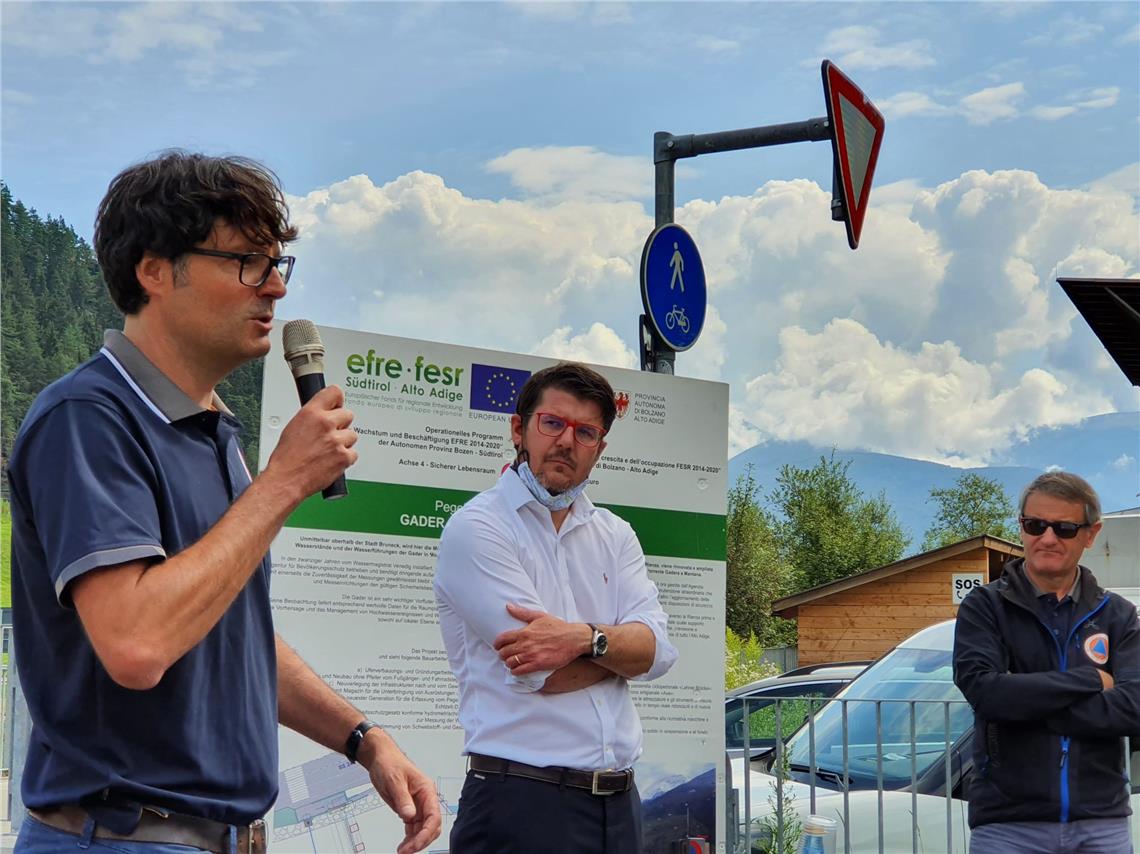 Per la stazione idrometrica di Mantana si sono aggiunti due ulteriori lotti dei lavori per complessivi 360.000 euro che hanno consentito la realizzazione anche delle opere seguenti, ha aggiunto Dinale, responsabile del progetto: rifacimento e adattamento alle esigenze di misura della passerella ciclopedonale Schraffl, posa della tubazione del gas di Südtirolgas al di sotto del torrente Gadera, sostituzione della fermata dell'autobus sulla strada statale della Val Badia, ristrutturazione dell'areale della stazione di misura, realizzazione di una postazione di pompaggio per i locali vigili del fuoco volontari. Durante la presentazione del progetto è stata sottolineata in particolare l'ottima collaborazione tra le Ripartizioni e gli Uffici provinciali, come anche con tutti gli altri enti coinvolti come Comune, Comunità comprensoriale, gestori delle infrastrutture. Un ringraziamento è andato anche a collaboratrici e collaboratori dell'Agenzia per la Protezione civile, al responsabile di progetto e alla ditta esecutrice della maggior parte dei lavori, così come ai progettisti esterni e delle oltre 60 ditte e fornitori, per lo più locali, che hanno a loro volta collaborato alla realizzazione e alla buona riuscita del progetto.