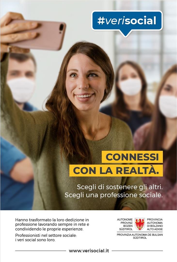 La campagna #verisocial, che è stata avviata da alcuni giorni, si propone di sensibilizzare l’opinione pubblica in merito all’importanza delle professioni sociali. Da un lato si vuole evidenziare le opportunità occupazionali offerte da questo settore anche per il futuro e dall’altro vengono sottolineate la professionalità e le molteplici figure professionali di questo settore. Nell’ambito della campagna due donne e due uomini, che nella vita reale svolgono varie professioni sociali come operatori socio assistenziali o socio sanitari, assistenti sociali o educatori sociali, descrivono la loro attività e l’ambito in cui lavorano. Parallelamente nella pagina web www.verisocial.it si possono trovare preziose informazioni riguardo ai diversi profili professionali ed alle opportunità formative esistenti a livello provinciale.