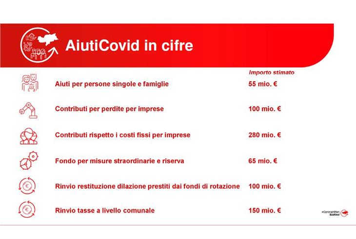 Il nuovo pacchetto prevede misure di sostegno per persone singole e famiglie per 55 milioni di euro. Per le imprese ci sono contributi per le perdite subite durante la pandemia per 100 milioni di euro e contributi per i costi fissi per un totale di 280 milioni di euro. Inoltre un fondo per misure straordinarie e di riserva sarà alimentato con 65 milioni di euro. Cento milioni di euro saranno anche destinati al rinvio della restituzione dei prestiti delle rate dei prestiti. Altri 150 milioni di euro saranno spesi per il rinvio delle tasse comunali.