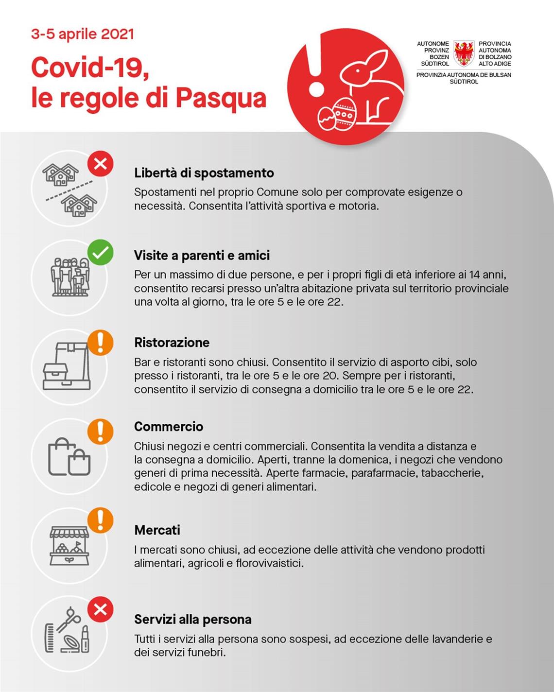 Per quanto riguarda il periodo di Pasqua (3, 4 e 5 aprile), così come previsto a livello nazionale, vi sarà la possibilità per massimo due persone (i ragazzi sotto i 14 anni, le persone conviventi con disabilità o non autosufficienti sono esclusi dal computo) di spostarsi una volta al giorno, tra le 5 e le 22, verso un'altra abitazione privata situata in Alto Adige. Gli spostamenti nel proprio Comune saranno possibili solo per comprovate esigenze o necessità (consentita l’attività sportiva o motoria), bar e ristoranti saranno chiusi, con la possibilità per questi ultimi di effettuare servizio di asporto tra le 5 e le 20 e servizio a domicilio tra le 5 e le 22. Chiusi anche centri commerciali e negozi, ad eccezione (tranne la domenica) dei negozi di prima necessità. Potranno essere invece sempre aperte farmacie, parafarmacie, edicole, tabaccherie e negozi di generi alimentari. I mercati, inoltre, saranno chiusi, ad eccezione delle attività che vendono prodotti alimentari, agricoli e florovivaistici. Sospesi tutti i servizi alla persona tranne lavanderie e servizi funebri.