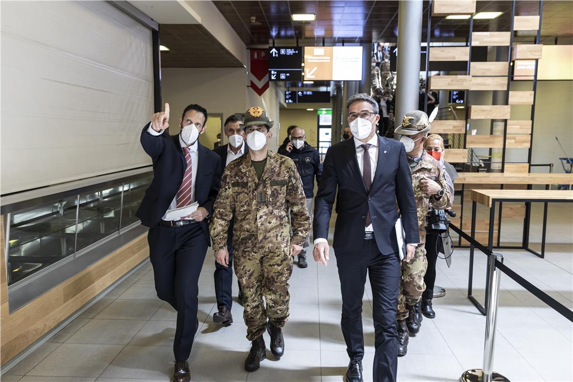 Il commissario all'emergenza Covid-19 Figliuolo e il capo della Protezione civile nazionale Curcio accompagnati dal presidente della Provincia Kompatscher al centro vaccinale di Bolzano.