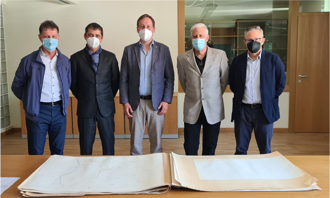 Il dirigente del Libro fondiario e il direttore dell’ufficio del Catasto di Trento hanno consegnato all’assessore Bessone i documenti storici di Colle Santa Lucia.
