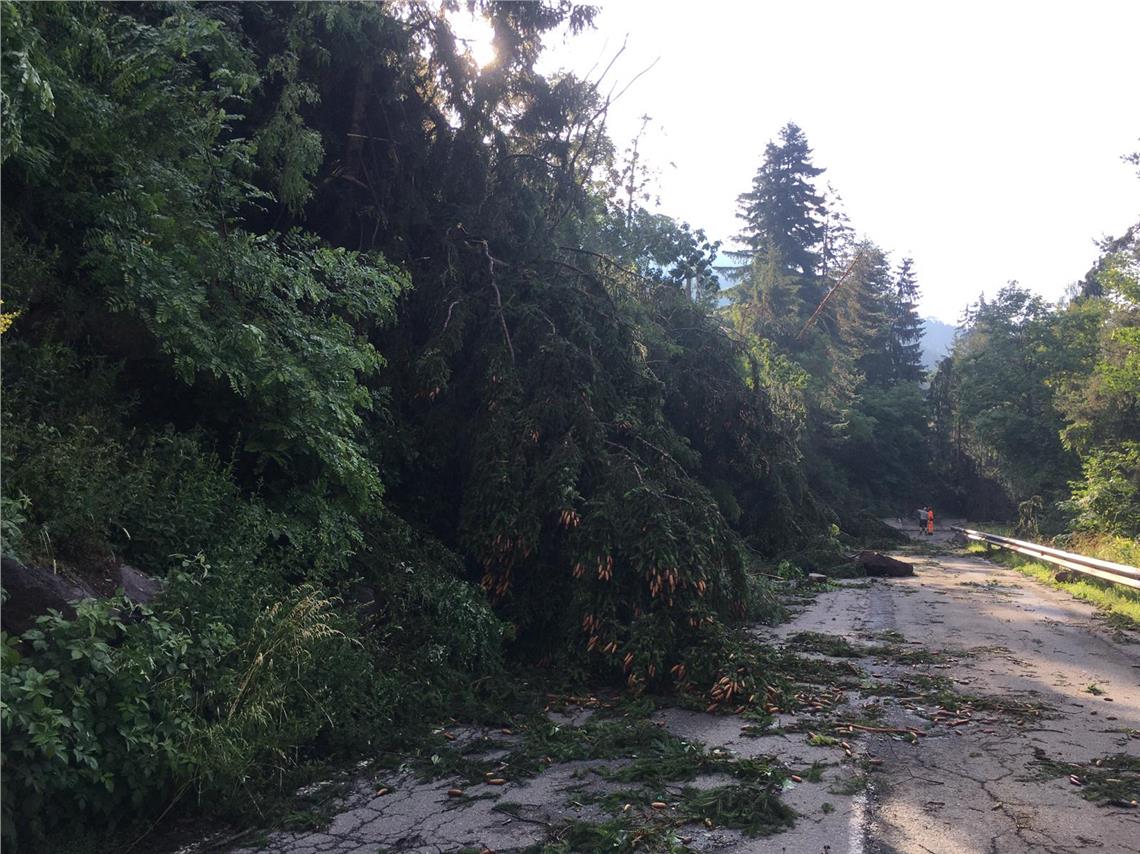 A causa delle forti raffiche di vento, nella notte tra mercoledì 7 e giovedì 8 luglio, numerosi alberi sono stati sradicati e sono caduti sulla strada statale 242 della Val Gardena insieme a molto materiale e sassi.