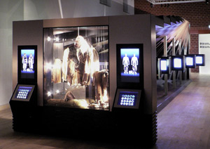 Die Wanderausstellung "ÖtziCultour" kommt gänzlich ohne Originale aus. Diese bleiben sicher konserviert im Archäologiemuseum in Bozen, in das die Besucher der Ausstellung übrigens einen Blick werfen könne, und zwar mittels einer Liveschaltung via Webcam. Touchscreens mit virtuellen Animationen - etwa von Ötzis Kleidung - ergänzen die Möglichkeiten einer interaktiven Wissensvermittlung.