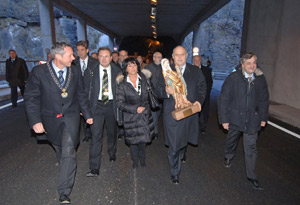 Pfarrer Hermann Zwick segnete den neuen Straßenabschnitt und den Tunnel, der von den Landeshauptmann Durnwalder, Landesrat Mussner und den Bürgermeistern offiziell eröffnet wurde. In den Bildstock am Tunnelportal stellten die Landesvertreter und Bürgermeister eine Statue der Heiligen Barbara, die Wally Pichler gestiftet hat.