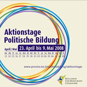 Die Aktionstage „Politische Bildung“ gibt es in Österreich und Deutschland schon seit Jahren. 2008 werden sie erstmals auch in Südtirol stattfinden. Ziel der Aktionstage ist es, durch den gebündelten Auftritt in einem bestimmten Zeitraum darauf aufmerksam zu machen, wie wichtig politische Bildung in demokratischen Gesellschaften ist.