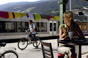 (LPA) Auch in diesem Jahr können Radler wieder bequem die Vinschger Bahn benutzen, um an den Ausgangspunkt ihrer Tour zu gelangen. Mit der Eventcard, die wieder aufgelegt wird, kann man um 14 Euro einen ganzen Tag lang den Zug zwischen Meran und Mals nutzen und an einer der sechs Radverleih-Stationen an der Strecke eines der angebotenen Mountain-, City- oder Trekkingbikes ausleihen.