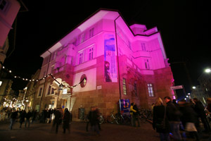 Das Südtiroler Archäologiemuseum in der Museumstraße präsentiert sich ab 17 Uhr in einer pinken Atmosphäre: pinkes Licht in den Räumen, pinke Dingsdas aus dem Alltag schlüpfen in die Vitrinen des Museums. Ein Suchspiel entführt Kinder und Erwachsene auf unterhaltsame Phantasie-Reisen. Ab 20 Uhr können die Besucher es sich in der Pink–Lounge gemütlich machen, den Jazz-Klängen der Gruppe Soul Breeze lauschen und pinke Köstlichkeiten naschen. Bunte Akzente setzen die Pantomimen Smarties.