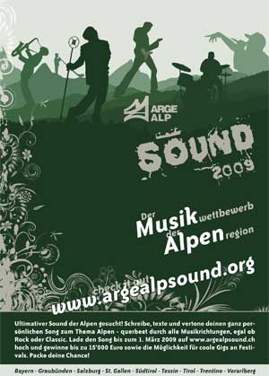 Unter dem Vorsitz des Kantons Graubünden hat die Arge Alp, der auch Südtirol angehört, nun den Wettbewerb "Arge Alp Sound 2009" ausgeschrieben. Er soll junge Menschen dazu anspornen, sich kreativ mit ihrem Lebensraum und dem Thema Alpen auseinanderzusetzen. Am Wettbewerb beteiligen können sich Solokünstler bis zum vollendeten 30. Lebensjahr sowie Bands, in denen das Durchschnittsalter aller Bandmitglieder nicht höher als 30 ist. Voraussetzung für die Teilnahme ist der feste Wohnsitz in einem der Mitgliedsländer der Arge Alp, wobei diese Voraussetzung bei Bands von mindestens der Hälfte der Mitglieder erfüllt werden muss.