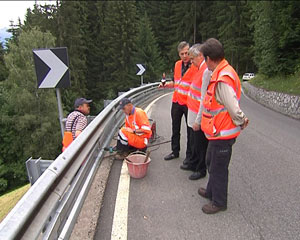 Derzeit werden die bei Motorradfahrern besonders beliebten Strecken, also in erster Linie die Passstraßen mit den Motorradfahrer-freundlichen Leitplanken ausgestattet. So hat Landesrat Mussner die Montage der Abweiser entlang der Jaufenstraße in Gasteig unter die Lupe genommen. "Wir schließen hier die Lücke zwischen Straße und Leitplanken, was zur Folge hat, dass stürzende Motorradfahrer an den Abweisern entlang schlittern", so Mussner. Dies bringe mit sich, dass die Aufprallenergie und damit auch die Verletzungsgefahr im Vergleich zu einem frontalen Aufprall deutlich verringert werde. Zudem werde verhindert, dass stürzende Motorradfahrer unter den Leitplanken durchrutschen können.
