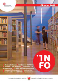 Die nun erschienene Oktober-Nummer von "Info" gibt einen Überblick über Beschäftigte in Schulamt, Pädagogischem Institut und Pädagogischen Beratungszentren sowie deren Zuständigkeitsbereiche. Darüber hinaus finden sich im soeben erschienen Heft der Schulkalender zum Schuljahr 2009/2010, statistische Eckdaten zu den deutschsprachigen Kindergärten und Schulen im Lande, das Verzeichnis der Kindergarten- und Schuldirektionen, Angaben zum Landesbeirat für Evaluation und der Evaluationsstelle und die derzeitigen Mitglieder des Landesschulrates.