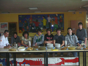 Nach der theoretischen Einführung ging's ans Eingemachte, galt es doch, ein mittelalterliches Buffet vorzubereiten. Das hieß für die Teilnehmer des Kurses - übrigens alle männlich - Nudelteig herzustellen, mit Hackfleisch und Spinat gefüllte Maultaschen vorzubereiten, Hühnerpasteten mit Ingwer zu backen, Hirsebrei zu rühren sowie Gemüse für Hirsebrätlinge und Dinkelrisotto zu schneiden. Außerdem mussten Apfelscheiben zum Trocknen aufgehängt und anschließend zu Marmelade verkocht werden.