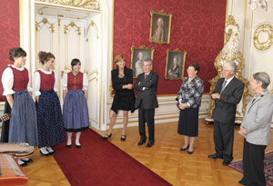 Der Bundespräsident bedankte sich und bat die Landesrätin, dem Landeshauptmann und der gesamten Südtiroler Landesregierung seine Grüße zu überbringen. Er ging kurz auf die enge Verbindung Österreichs zu Südtirol ein und zeigte sich höchst erfreut über das musikalische Ständchen, das ihm der Mädchendreigesang aus Klausen und die Musikgruppe Holzklang darbrachten. Die Musikerinnen und Musiker aus Südtirol spielten und sangen auch für die zu einem Arbeitsessen eingeladenen Vertreter und Vertreterinnen der obersten Organe, darunter Nationalratspräsidentin Barbara Prammer.