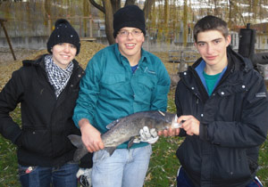 Praktikum am Fischteich: die Schüler der Fachschule Fürstenburg (v.li.) Kathrin Prantl, Roland Gamper und Markus GreifMit Unterstützung der Lehrpersonen Vanessa Boscolo, Andreas Platter und von Praxislehrer Othmar Telfser zogen die Schülerinnen und Schüler ein Netz mit Gewichten durch den Fischteich. Insgesamt wurden an die hundert Fische entnommen. Der Bestand setzte sich aus Rotfedern, Rotaugen und Silberkarpfen zusammen. Auch einige Graskarpfen mit einer Länge von mehr als sechzig Zentimetern wurden gefangen. Schüler und Lehrpersonen dankten dem Fischteichbesitzer für die Unterstützung bei dieser Praxiseinheit und für die herzliche Bewirtung.