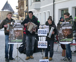 Die Schulband, eine Bläsergruppe und ein Ziehharmonika-Ensemble, alle aus Schülern der GOB Bruneck, trafen sich am vergangenen Samstag, 18. Dezember, am Graben in Bruneck, tatkräftig unterstützt von Mitschülern, Professoren und Direktor Werner Sporer um trotz Eiseskälte Musik zu machen. Mit weihnachtlichen Weisen, besinnlichen Arrangements und gekonntem Reggae-Sound gelang es den Musikern, die in vorweihnachtlichem Stress vorbeieilenden Passanten zum Stehenbleiben und Zuhören zu bewegen.