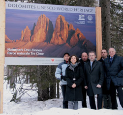 LPA - Die sieben Südtiroler Naturparks erhalten im Bereich der Hauptzugänge neue Informationsschilder. Ein Bild der Panoramatafeln des Naturparks Drei Zinnen machten sich am Wochenende Landesrat Michl Laimer, die Bürgermeister von Toblach, Sexten und Innichen, der Präsident des Naturparks Drei Zinnen, Adolf Hell, sowie Maria Pallhuber vom Landesamt für Naturparke.