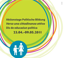 Politische Bildungsarbeit sichtbar machen und möglichst viele Personen zur Mitarbeit im politischen Bildungsbereich zu motivieren, ist das Ziel der Aktionstage Politische Bildung. Im Sinne des Mottos des Europarates "Education for Democratic Citizenship" sollen sie Demokratie und Menschenrechte, Partizipation und aktive Bürgerschaft stärken. Im deutschsprachigen Raum - in Deutschland, in Österreich und dem deutschsprachigen Teil Belgiens - haben die Aktionstage bereits eine mehrjährige Tradition, in Südtirol wurden sie vor vier Jahren erstmals veranstaltet, wobei sowohl bei den Veranstaltern als auch bei den Bürgern zunehmendes Interesse zu verzeichnen ist.