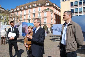 LPA - Bis zum 26. April bringen großformatige Fotos Ansichten der Dolomiten in das Herz der Stadt Bozen. "Reichtum und Schönheit dieser Landschaft", unterstrich Umwelt-Landesrat Michl Laimer heute (6. April) bei der Ausstellungseröffnung, "sollen die Botschaft in die Herzen aller bringen, dass wir an einem der schönsten Plätze der Welt leben."