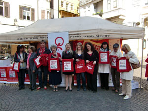 LPA - Der Landesbeirat für Chancengleichheit hat am heutigen (15. April) Aktionstag in Zusammenarbeit mit den KVW-Frauen rote Stofftaschen und Informationsmaterial verteilt und ist dabei, wie die Beiratsvorsitzende Ulrike Oberhammer erklärt, auf reges Interesse gestoßen.