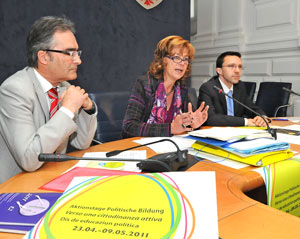 Das Kooperationsprojekt der beiden Landesämter für Weiterbildung und der drei Bereiche für Innovation und Beratung der Bildungsressorts sieht sprachgruppenübergreifend 99 Veranstaltungen von 46 Trägerorganisationen vor. Bildungslandesrätin Kasslatter Mur freute sich bei der heutigen Vorstellung über die "bunte Vielfalt, damit jede und jeder etwas Ansprechendes findet". Landesrat Tommasini hob die Bedeutung der Aktionstage hervor, die dazu führen sollen, "eine aktive, bewusste, mehrsprachige Gesellschaft heranzubilden". Die Aktionstage zwischen dem Welttag des Buches am 23. April und dem Europa-Tag am 9. Mai sollen, wie Kasslatter unterstrich, "politische Bildungsarbeit sichtbar machen und möglichst viele Akteurinnen und Akteure zur Mitarbeit im politischen Bildungsbereich motivieren". Veranstalter sind heuer neben den klassischen Weiterbildungseinrichtungen wieder viele Bildungsausschüsse, Vereine, Schulen, Gemeinden, Bibliotheken und auch einige Privatpersonen (Verzeichnis sämtlicher Initiativen als PDF im Anhang). Die Jugendlichen, erklärte Theodor Rifesser, Direktor des Bereiches Innovation und Beratung des ladinischen Bildungsressorts, wären bereit, mehr Verantwortung zu übernehmen, wenn sich ihnen die Themenbereiche erschließen würden. Das Landesamt für Weiterbildung hat in Zusammenarbeit mit der Urania Meran vier Kurzfilme erstellt, in der in zehn Minuten die Politik auf Gemeinde-, auf Landes-, auf Staats- und auf Europa-Ebene vorgestellt werden; die Filme sind in den Landesämtern für Weiterbildung und für audiovisuelle (AV-)Medien erhältlich. Mit diesem Informations-Bündel soll bewusst gemacht werden, dass politischer Bildung in demokratischen Gesellschaften eine besondere Bedeutung zukommt.
