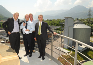 Im Anschluss besichtigte der Landesrat gemeinsam mit dem Meraner Bürgermeister Günther Janutz, dem Präsidenten der Bezirksgemeinschaft Burggrafenamt Alois Kröll sowie dem Präsidenten und dem Direktor der eco center AG, Stefano Fattor und Marco Palmitano, die neuen Anlagenteile der Kläranlage Meran. Seit Juli 2009 verfügt diese über einen dritten Faulturm, durch den das Volumen für die anaerobe Schlammbehandlung von 5.800 Kubikmeter auf 9.800 Kubikmeter erhöht werden konnte. "Mit dem dritten Faulturm haben sich die Betriebsbedingungen der Kläranlage Meran deutlich gebessert", betont Michl Dekas, Betriebsleiter der Kläranlage Meran. "Der Turm trägt wesentlich zur Vermeidung der Geruchsbelästigung durch die Kläranlage bei und die Stromproduktion aus dem Faulgas ist in Kombination mit den neuen Gasmotoren gestiegen, während die zu entsorgende Schlammmenge abgenommen hat."