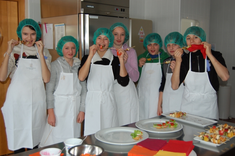 In der Küche bereiteten die Schüler und Schülerinnen unter dem Motto "Kochen mit Genuss und Farbe" Aufstriche in verschiedenen Farben zu; diese wurden dann als gesunde Minisnacks angeboten und verkostet. Im Speisesaal fertigten sie kreative Tischgestaltungsmöglichkeiten für besondere Anlässe an.