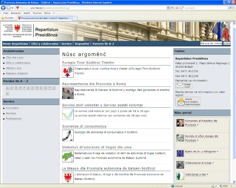LPA - Die erst vor kurzem neu gestaltete Homepage der Landesabteilung "Präsidium" gibt es nun auch in ladinischer Sprache. "Es ist uns ein Anliegen, die Bürgerschaft in allen drei Sprachen zu informieren", so Landeshauptmann Luis Durnwalder, dem die Abteilung unterstellt ist.